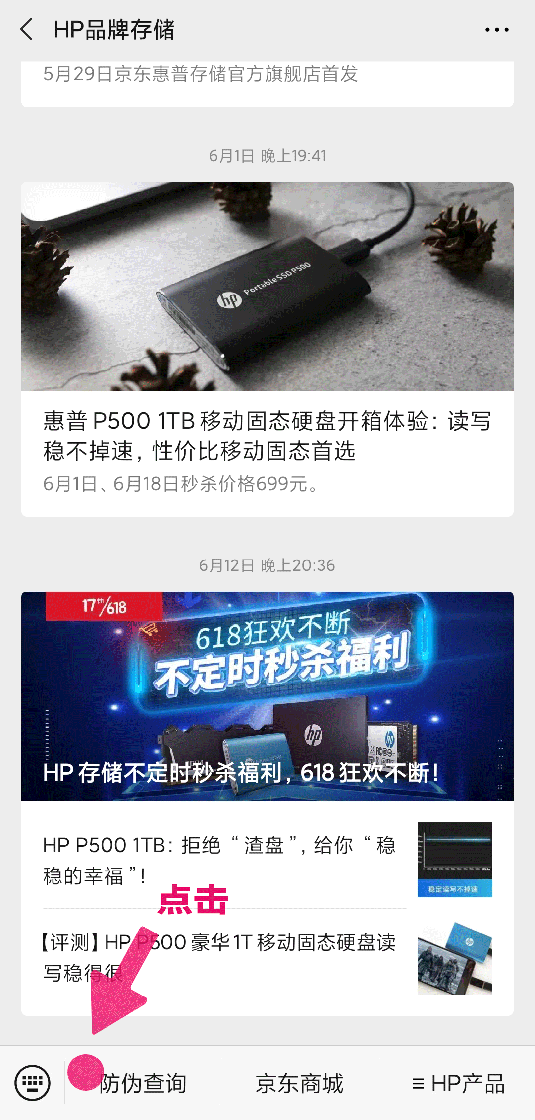 關注“HP品牌存儲”微信公眾號,點擊菜單欄“防偽查詢”,即可進入HP存儲產品防偽查詢小程序。