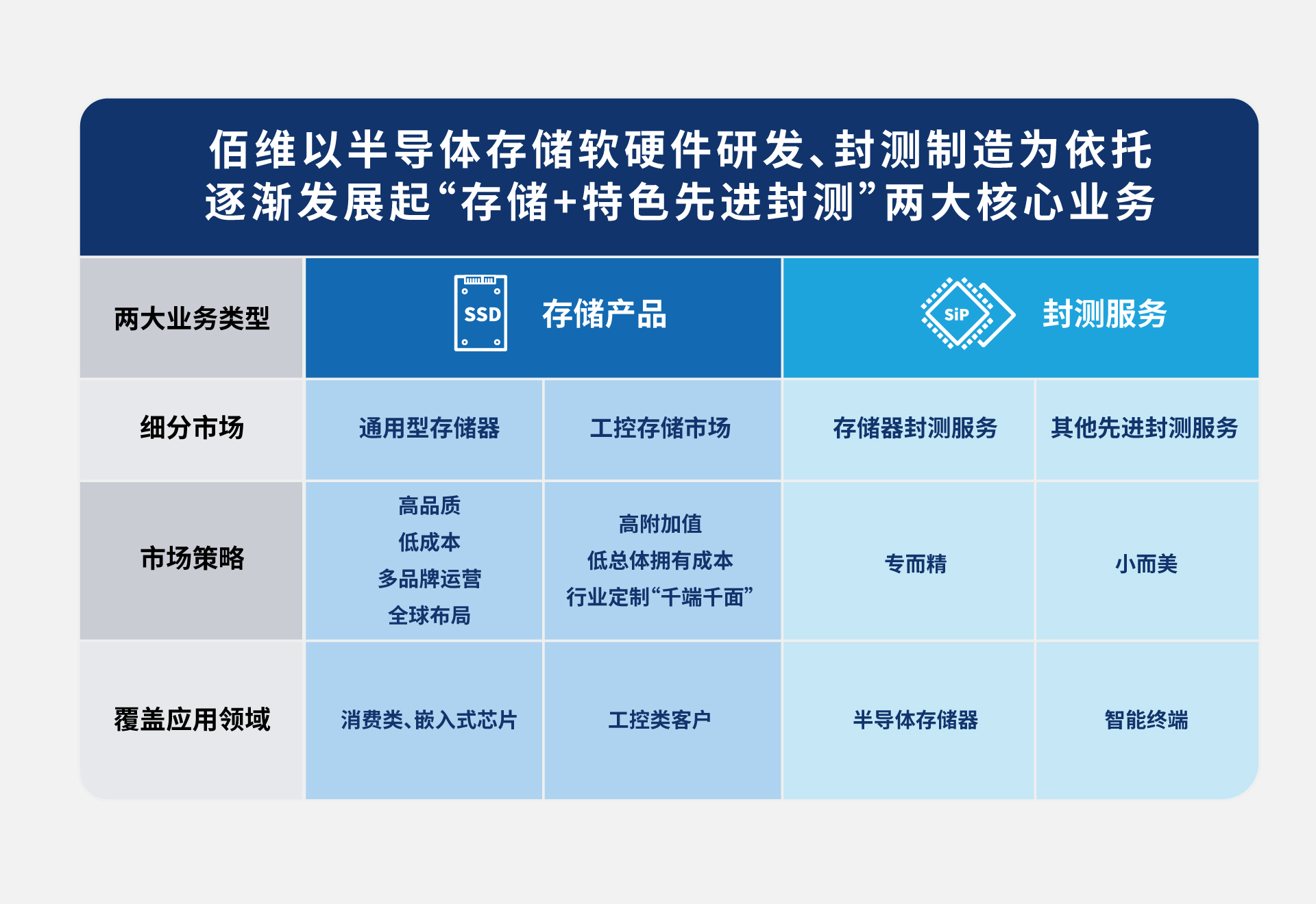 佰維多年來專精于半導(dǎo)體存儲器的創(chuàng)新研發(fā)與封測制造,布局了全系列、全容量、全場景應(yīng)用的存儲產(chǎn)品線矩陣,涵蓋了標(biāo)準(zhǔn)化、規(guī)模化的通用型存儲器以及“千端千面”的行業(yè)定制化方案,最終實(shí)現(xiàn)從客戶端需求開發(fā)到最終產(chǎn)品端量產(chǎn)的一站式交付能力。佰維是國內(nèi)最早布局封測制造的存儲企業(yè),優(yōu)異的封測制造工藝賦予了公司更靈活的和快速響應(yīng)的定制化優(yōu)勢,通過研發(fā)與封測實(shí)力不斷賦能存儲芯片小型化、大容量與低功耗,進(jìn)而滿足終端設(shè)備日益輕薄與高集成度的需求。