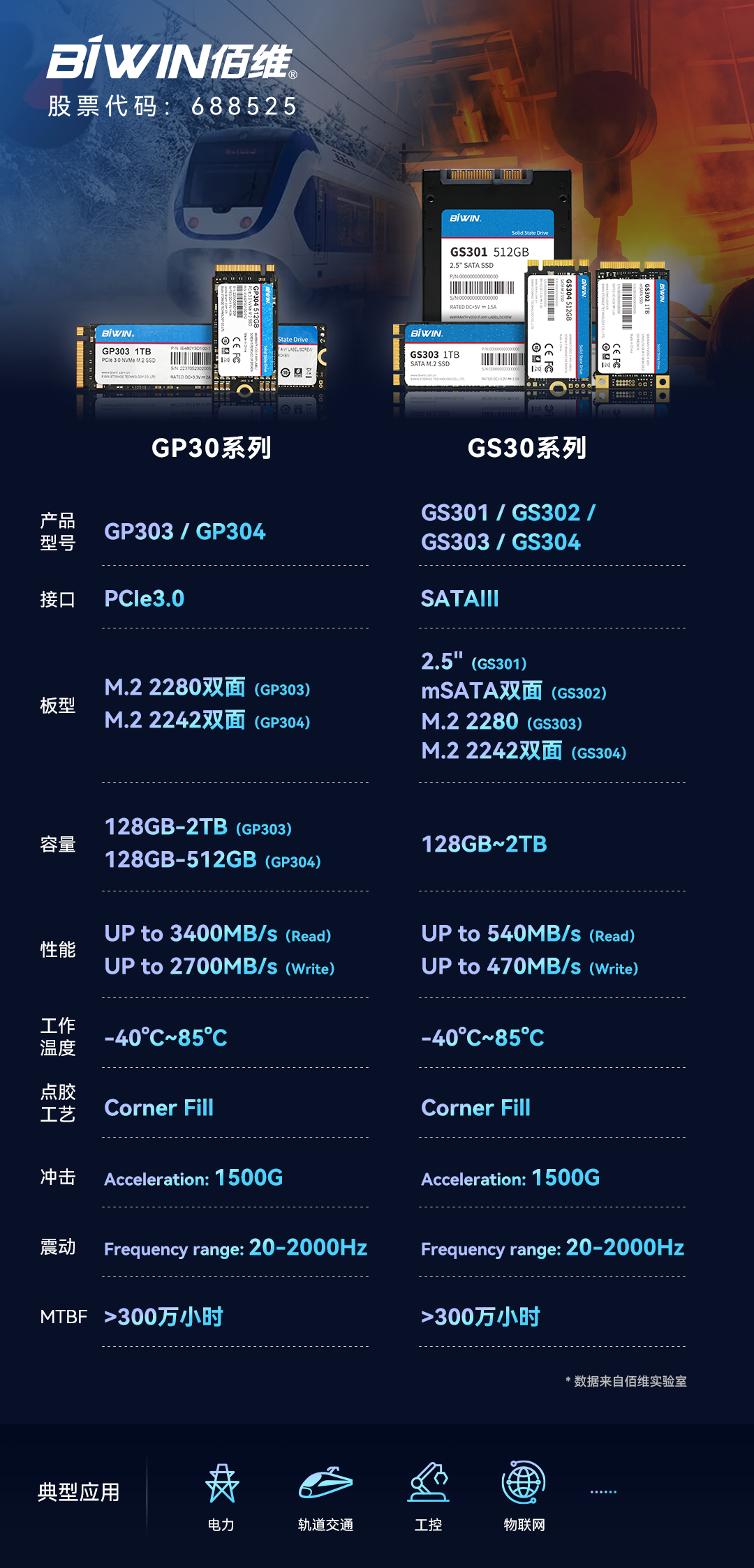 近日,佰維針對極端溫度等工作環境推出多款工業級寬溫SSD產品,包括GP303、GP304、GS301、GS302、GS303、GS304等。系列產品采用國產品牌3D NAND晶圓和主控,同時依托公司存儲解決方案研發稟賦下的介質特性研究及篩選、固件算法開發、硬件設計、先進制造等能力,使得產品具備高性能、高穩定、高可靠和更安全等優勢,廣泛適用于電力、物聯網、5G、智能制造、軌道交通、工業控制等領域。
