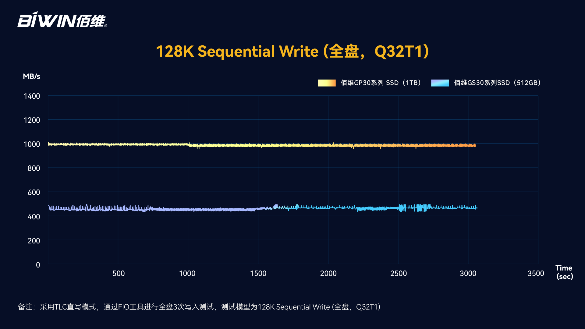 通過搭配全自研固件,系列產品具備優異的性能,其中GP30系列SSD采用PCIe Gen3.0x4接口、NVMe1.4協議,最高順序讀寫速度分別達到3400MB/s、2700MB/s,容量最高可達2TB。此外,基于固件的多重優化,GP30/GS30系列SSD的數據持續讀取、寫入性能穩定,在FIO測試中,GP30系列SSD全盤寫入速度約保持在1000MB/s,GS30系列SSD全盤寫入速度約保持在450MB/s