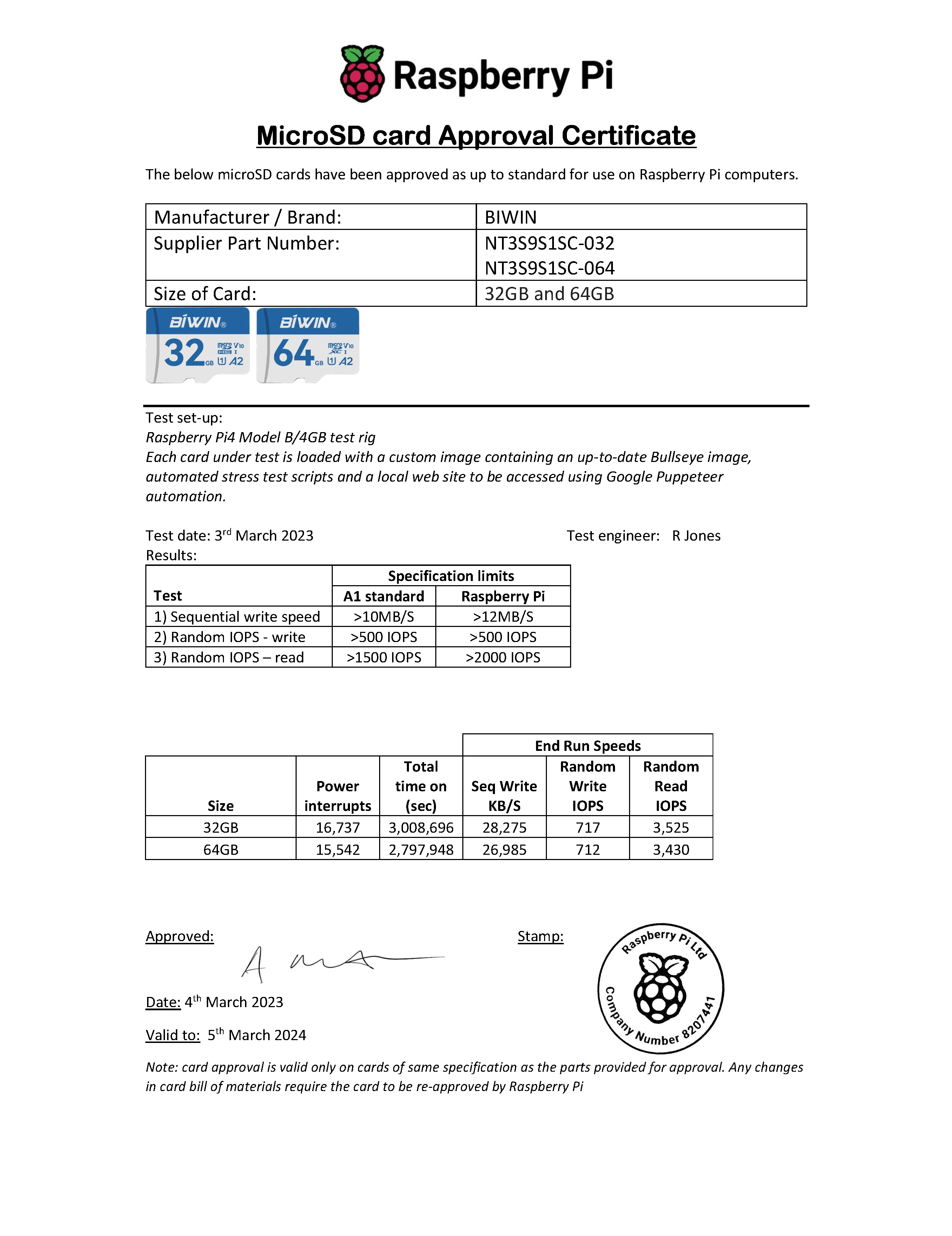TF200系列microSD卡在Raspberry Pi 4 Model B/4GB平臺上經(jīng)過了一系列嚴苛的測試,包括每塊待測板卡均加載自定義的圖像(含最新的Bullseye圖像),自動壓力測試腳本,以及可使用Google Puppeteer自動進行訪問的本地網(wǎng)站等測試內(nèi)容。經(jīng)過超過15000次斷電測試和超過270萬秒的長時間運行,產(chǎn)品連續(xù)寫入速度>26MB/s,隨機寫入速度高達717 IOPS,隨機讀取速度高達3525 IOPS,符合樹莓派測試指標要求,護航樹莓派高效穩(wěn)定運行。