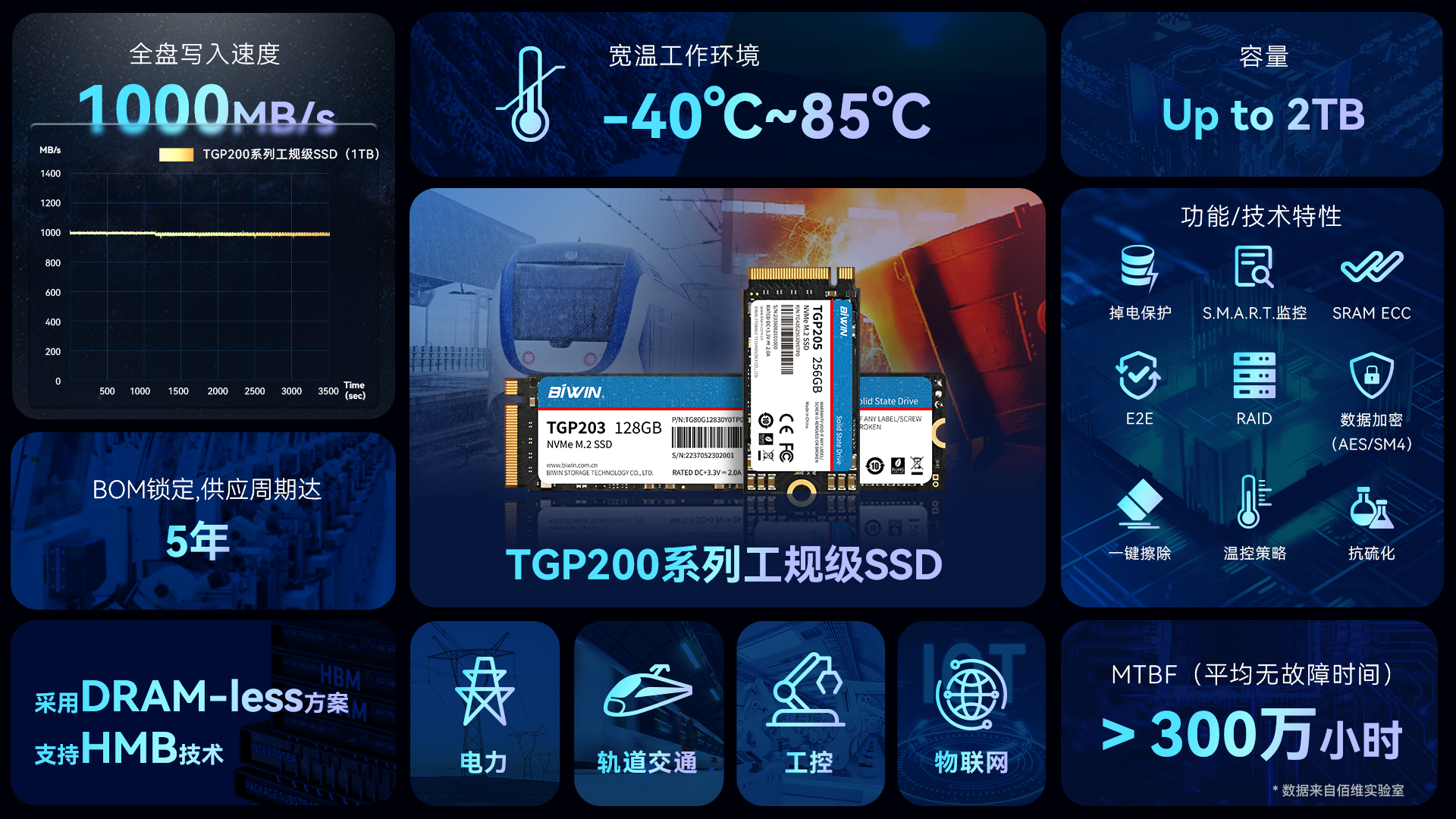 在可靠性方面,TGP200系列產(chǎn)品均采用了符合寬溫標(biāo)準(zhǔn)的閃存顆粒、元器件,并經(jīng)過高低溫測試、功能測試、硬件測試、性能測試、可靠性測試、兼容性測試等多重嚴(yán)苛測試驗證,支持-40℃~85℃寬溫工作、-55℃~95℃寬溫存儲、掉電保護(PLP)、S.M.A.R.T.監(jiān)控、RAID、ECC、E2E、溫控策略等特性,MTBF高達300萬小時,可從容應(yīng)對極端溫度、異常斷電等嚴(yán)苛環(huán)境,有效保證數(shù)據(jù)的可靠性與完整性。同時,公司可提供抗硫化、三防涂層、一鍵擦除、數(shù)據(jù)加密等客制化服務(wù),進一步保護產(chǎn)品,延長產(chǎn)品壽命。