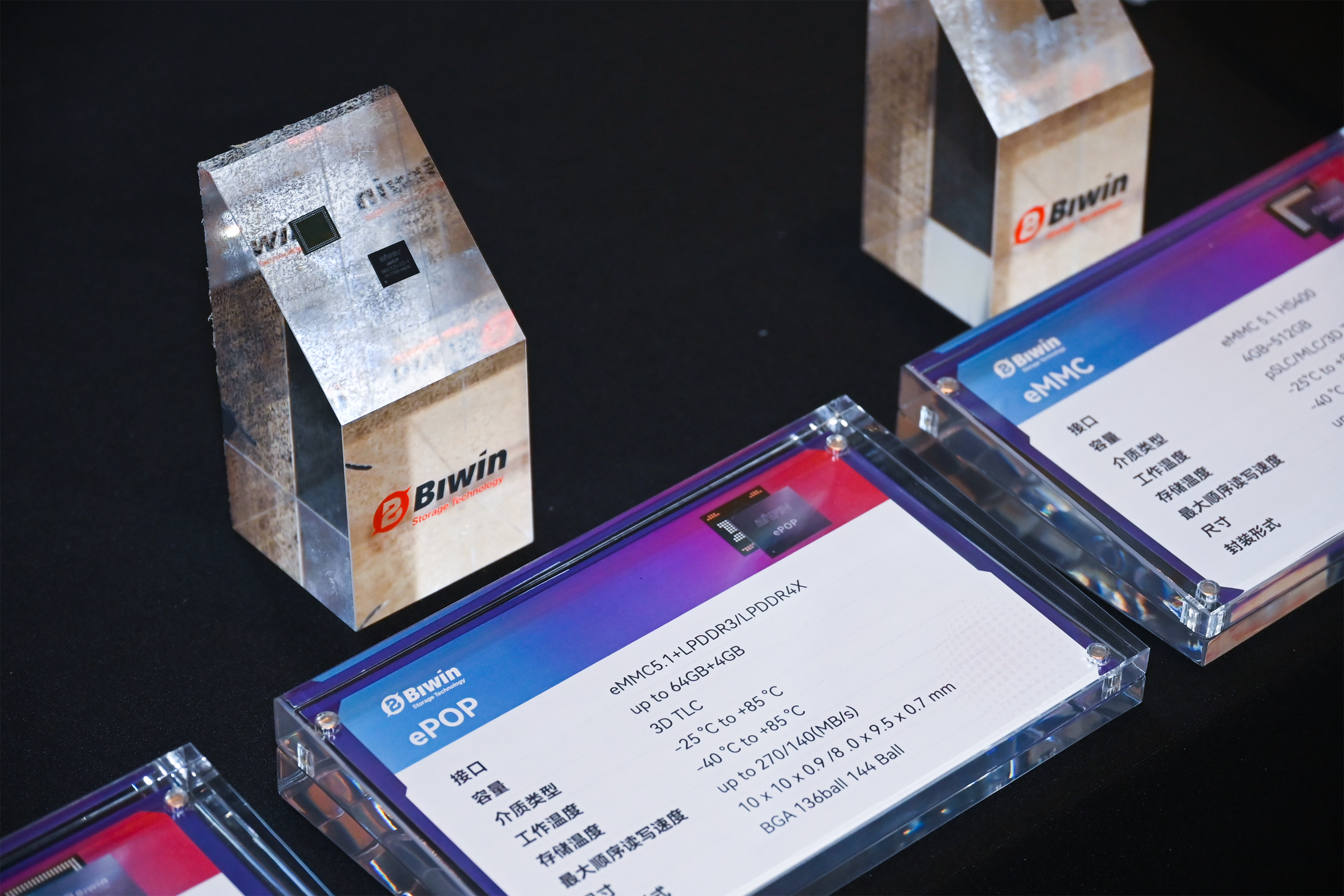 佰維eMCP4x、ePOP4x基于多層疊Die、超薄Die、多芯片異構集成等封裝工藝,集成了eMMC5.1和LPDDR4x,數據傳輸速率高達4266Mbps,且采用先進低功耗設計和優化電源管理技術,確保設備快速響應多種傳感器數據請求,處理多任務時保持流暢運行。其中,ePOP4x容量達32GB+2GB(將推出64G+2/3/4GB,賦能AR、VR等設備AI應用),尺寸小至8×9.5×0.7(mm),并通過直接貼裝在SoC芯片上,助力智能手表輕薄設計。目前,ePOP系列產品已廣泛應用全球知名企業高端穿戴設備中,并獲評“全球電子成就獎年度存儲器”、“最佳存儲芯片”、“‘中國芯’關鍵基礎支撐優秀產品”。