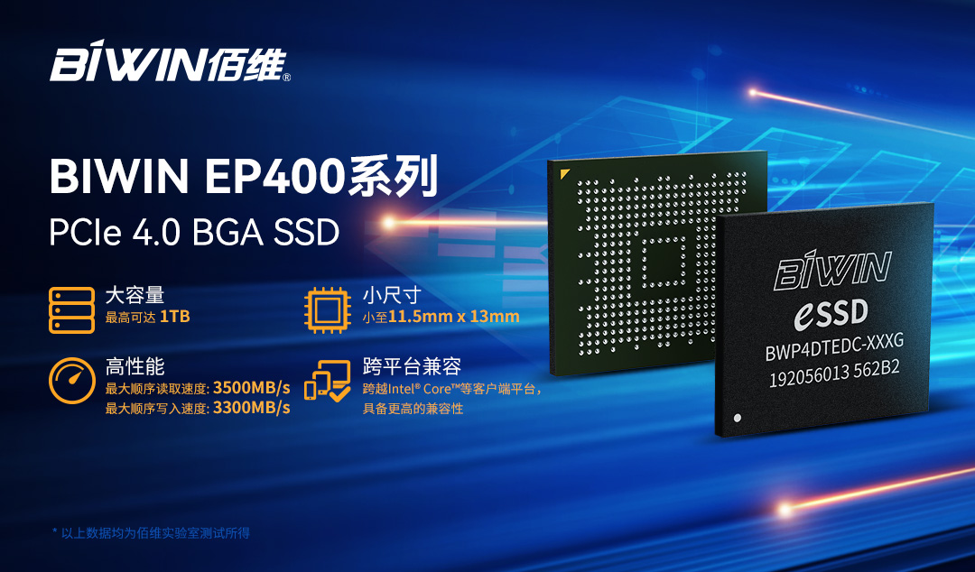 EP400系列PCIe 4.0 BGA SSD搭配PCIe Gen4x2接口,NVMe 1.4協議,單顆最大容量為1TB,而尺寸僅為11.5x13(mm),最大順序讀寫速度分別達到3500MB/s、3300MB/s